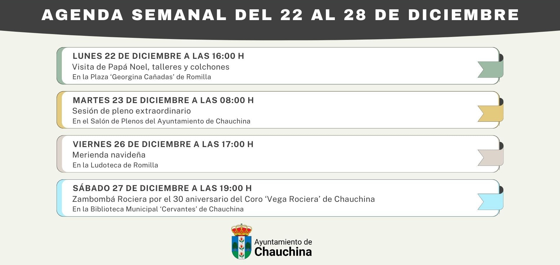 El Ayuntamiento de Chauchina informa de la agenda semanal del 22 al 28 de diciembre, que recoge una variada programación de actividades dirigidas a vecinos y vecinas de Chauchina y Romilla.
